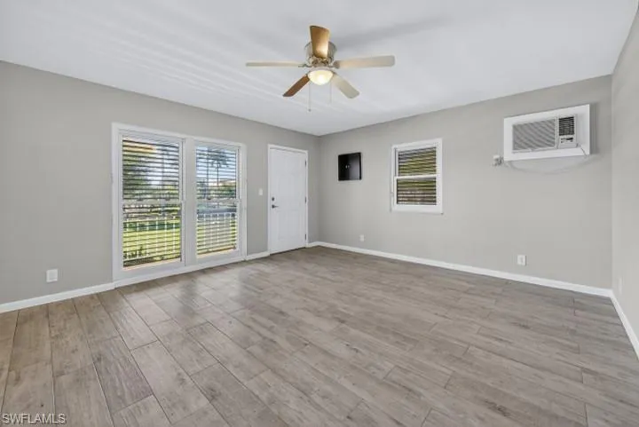 In 2020, updates were made to the kitchen and bathroom, and plank-style tile flooring was installed. The water heater is from 2020. The kitchen features a full-size stainless steel refrigerator, granite countertops, tall white shaker cabinets, a flat stove, and a microwave. The bathroom vanity is topped with granite, a toilet, and a herringbone-tiled walk-in shower. Three ceiling fans with light fixtures. Now it needs your personality and decor to call it home.