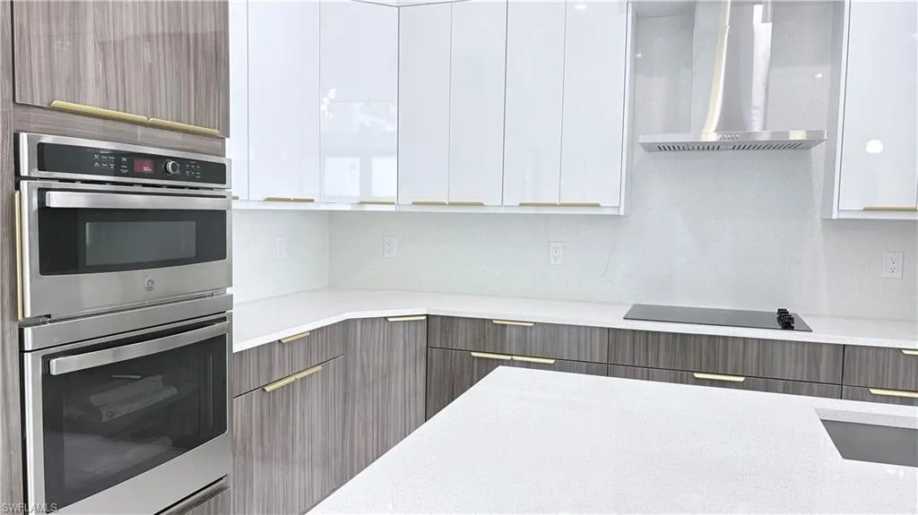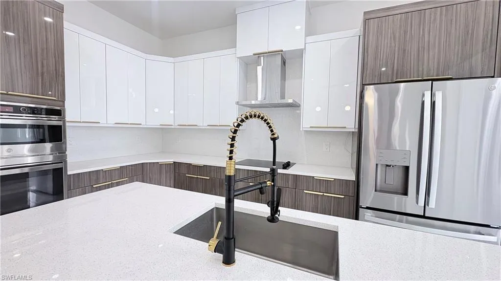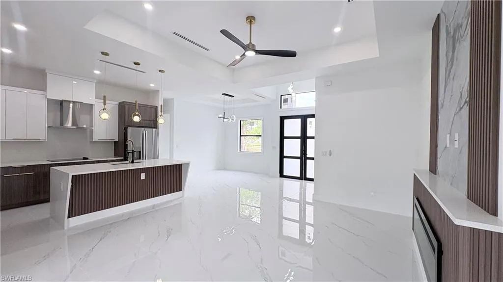 This 2026 New Construction Home sits proudly on a 2.27-acres oversized lot, offering the perfect blend of space, elegance, and functionality. From the striking metal impact double entry doors to the paver driveway and walkway, every detail is crafted to impress. Modern light fixtures, ceiling fans in every room, and a sleek contemporary fireplace. The gourmet kitchen features a white quartz waterfall island, 42” wood cabinets with crown and light molding, stainless steel appliances, a cooktop, dual microwave/oven, and a stylish hood. A fully equipped outdoor kitchen extends the living space—perfect for Florida entertaining. High-end finishes shine throughout: 24×48 porcelain tile flooring, 10’ ceilings, 8’ interior doors. The luxurious master suite includes a spacious two walk-in closet, a glass-enclosed shower, and a rainfall, waterfall, and massage jet system. Additional features include impact windows and doors, an advanced A/C system with individual room returns, and a full sprinkler system.