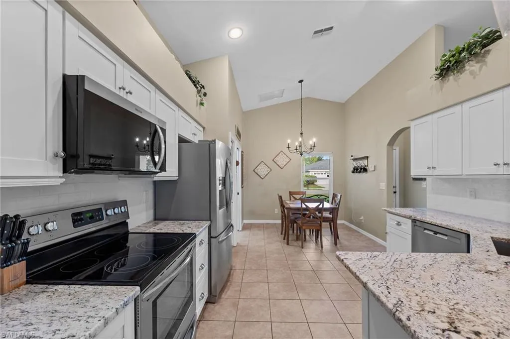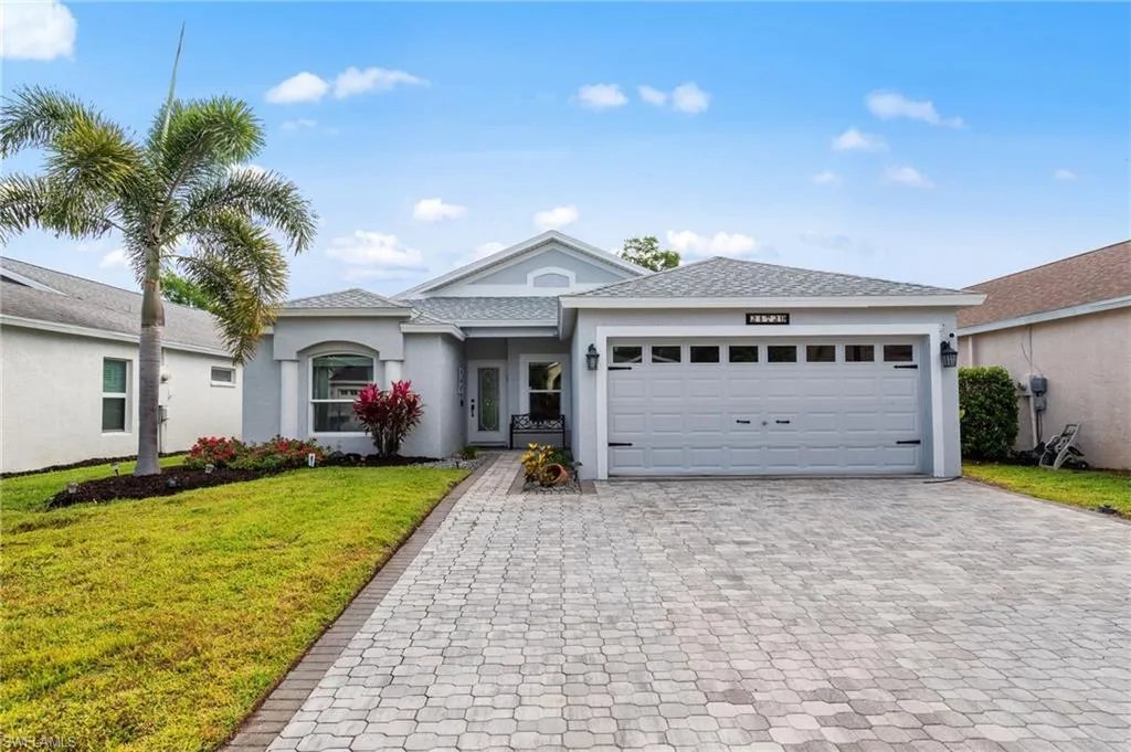 Lakefront 3 bedroom, 2 bath pool home featuring the highly desirable Augusta floor plan with an open great room concept, perfect for everyday living and entertaining. From the moment you enter, you are greeted by vaulted ceilings and an abundance of natural light, creating a bright and inviting atmosphere throughout the main living areas. The upgraded kitchen is a standout, offering wood shaker cabinets with soft-close doors and drawers, granite countertops, stainless steel appliances, and plenty of prep and storage space. The kitchen overlooks the spacious living and dining areas, making it ideal for hosting family and guests. The primary suite is generously sized and features a walk-in closet and an attached bath complete with dual sinks, a separate soaking tub and walk-in shower, and updated tile work for a modern touch. Two additional guest bedrooms and a full bath provide comfortable accommodations for family or visitors. Step outside to your private screened lanai where you can relax and enjoy peaceful lake views from your own pool. The pool area is enhanced with custom non-slip cushioned flooring, adding both comfort and safety, making it a perfect space to unwind or entertain year-round. This home also offers peace of mind with major updates already completed, including a newer roof, A/C system, and water heater. Impact-resistant windows throughout the home not only enhance safety but also improve energy efficiency and reduce insurance costs. With its ideal layout, quality upgrades, and stunning lakefront setting, this home is truly move-in ready and priced to sell. Stoneybrook is an incredible value with Internet and cable included, and the amenities offer something for everyone! Enjoy access to an exercise room, 3 community pools, tennis courts, pickleball, volleyball, basketball, bocce ball, a playground, and even a baseball field. The public golf course means you can pay as you play—no membership required. You’re just a short drive to the golf clubhouse, CVS, Publix, Miromar Outlets, and Hertz Arena. With low association fees and a full range of amenities, it’s easy to see why Stoneybrook remains one of Estero’s most popular communities.