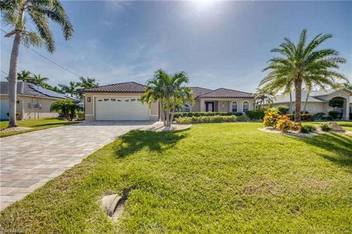 Prepare to be whisked away...this stunning Mediterranean inspired 3/2/2 pool home oozes luxury in every square inch. Royal Palm Tree lined street located in one of Cape Coral's premiere zip codes...amazing hand laid paver drive, entry walk way and lush tropical landscaping featuring Royal Palms invite a peek of what's inside.